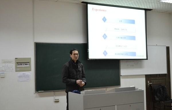 尹建华老师首先讲述了自己的人生经历,从读大学,到工作两年,到读研,再到日本大阪大学、美国奥克兰大学留学,同学们都仔细聆听,被尹老师丰富的经历吸引;接着又讲述了研究方向与导师的选择,其中提到要考虑自身的实力与机会,以及该方向对未来发展的影响,选择导师主要通过老师的推荐和自己联系两种途径;接下来从过去、现在、未来跨时空分析了是否出国的问题,以及是选择名气大的高校,还是选择专业学科强的高校,并且表示其当前的工作需要更多的支持;最后尹老师风趣幽默的讲述了事业与家庭以及国外生活的点滴,使同学们对今后科研道路有了更加具体和理性的认识,同时也让同学们对留学充满憧憬。尹建华教授讲述完成后,现场同学们积极响应,气氛十分热烈。