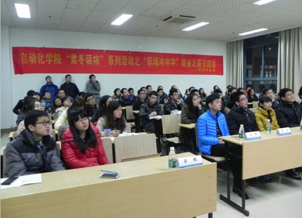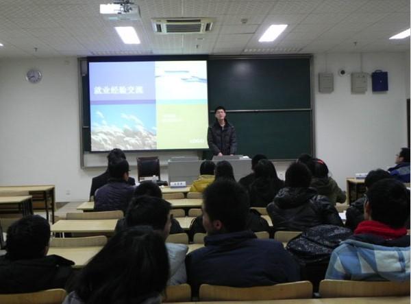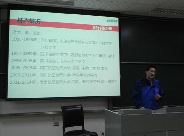 首先为现场同学作报告的是来自导航、制导与控制专业、签约中电10所的梁�同学,他分享了自己的简历制作过程,分析了自己求职过程中所考虑的因素,给同学们一个很好的参考。紧接着作报告的是来自导航、制导与控制专业、签约商飞的刘军同学,他认为除了具备科研能力外,自信也是自己求职成功的关键。随后出场的是来自控制理论与控制工程专业、签约无锡614所的陈阳同学,他认为求职成功的保障是要具备某一方面的特长,同时强调了简历制作要有重点。接下来作报告的是来自电气工程专业、签约通用电气(GE)的邢栋同学,他是六位中唯一签约外企的同学,他的成功经验告诉我们企业实习的重要性。紧接着作报告的是来自测试计量技术及仪器专业、签约华为的宋普庚同学,宋普庚同学表示自己没有其他几位同学善于言辞,但笔试及面试时的沉着、冷静以及充分的准备同样也为他赢得了好的工作机会。最后作报告的是来自测试计量技术及仪器专业、签约南京中新赛克的赵妍同学,她指出女生在求职中属于弱势群体,一定要摆正心态、理性应对就业压力。