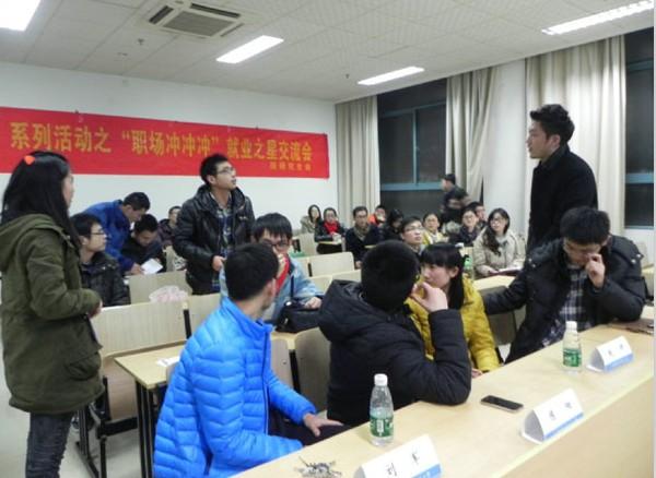 12月17日晚7点,由WilliamHill中文官方网站研究生会主办的“紫冬话坊”系列活动之“职场冲冲冲”就业之星交流会在A18楼218教室成功举办。本次活动有幸邀请到WilliamHill中文官方网站2011级硕士生梁�、刘军、陈阳、邢栋、宋普庚和赵妍六位就业之星与到场同学进行交流,研究生辅导员刘斐文也莅临现场出席了本次活动。