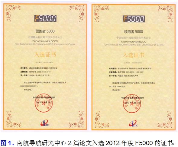中国科学技术信息研究所2013年未公布了“领跑者5000-中国精品科技期刊顶尖论文”入选论文,刘建业教授及其领导的南航导航研究中心团队共有4篇发表的期刊论文分别入选2012年度F5000论文及2013年度F5000提名论文,详情如下: