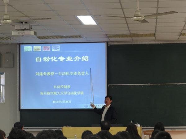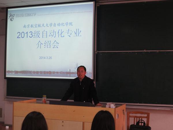 2014年3月26日下午,我院自动化专业介绍会在将军路校区6101教室举行。介绍会由自动化专业负责人刘建业教授主讲,自动控制系副主任盛守照老师、班主任代表郭彤、范胜林、齐瑞云老师列席了介绍会,自动化专业全体大一学生参加了此次介绍会。大一辅导员汤呈懿老师主持了本次介绍会。