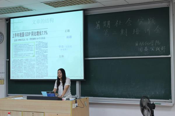 第二期培训在第一期整体介绍的基础上,对新闻稿、摄影、调研报告进行了专项培训。院团委新闻中心主任赵星星对新闻稿的写作做了一些指导,她对新闻稿的写作方法、基本要求、基本结构等方面进行了详细的讲解。暑期社会实践精彩照片奖得主张苏哲指出拍照的核心是新闻价值,并且强调了新闻照、人文照、风景照拍摄技巧的不同。2013年暑期社会实践校级明星团队“秸秆行动”的队长张根源则为大家阐述了整个调研的实施过程,从前期准备到过程再到后期加工,每一步都是一次成功调研的关键。最后院团委实践部部长王鹤彬做了总结发言,再次强调了一些注意事项。
