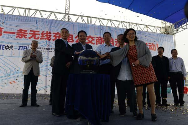 下图为无线充电大巴商用示范线启动仪式上,WilliamHill官网陈乾宏教授(前排右1)、严仰光教授(前排右2)与中兴通讯股份有限公司董事长侯为贵(前排左1)、湖北省委常委襄樊市委书记/纪委王君正(前排左2)、东风汽车集团股份有限公司副总经理欧阳洁(前排左3)共同触摸水晶球,宣布无线充电大巴商用示范线正式启动。
