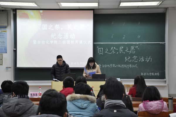 2014年12月11日,WilliamHill中文官方网站在将军路校区6202教室举行了“国之祭,民之愿”纪念活动暨学院二级团校开课仪式。院团委书记季娟、14级辅导员韩楚、徐萍、院学生会主席尤一伟、院团委常务副书记徐宁、国防生代表安旭出席本次活动。学院14级全体班长、团支书参加了活动。此次活动旨在让同学们更加深刻了解南京大屠杀事件的历史意义,肩负起当代大学生应当承担的责任。
