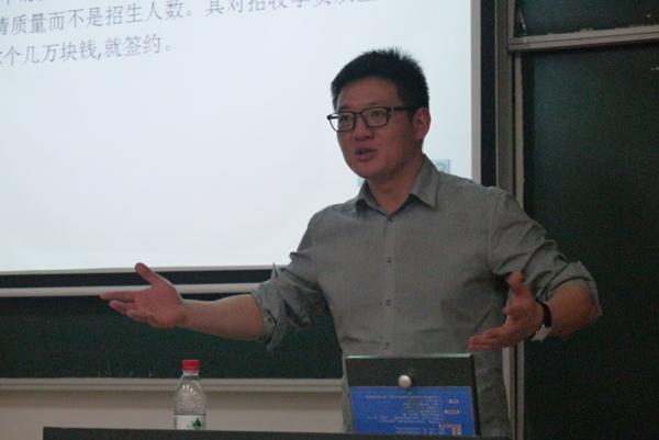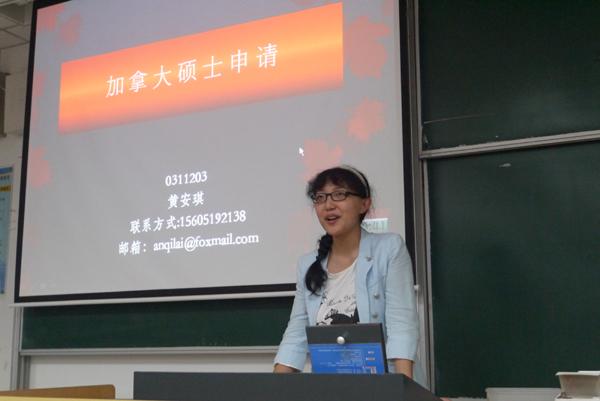 第一位上台的是黄安琪学姐,她已经拿到了加拿大英属哥伦比亚大学的offer。学姐认真地向我们介绍了她语言考试、材料准备的时间安排,给同学们提供了宝贵的时间借鉴经验。第二位上台的是周巍巍先生,作为专业中介,他向同学们介绍了目前全球各国大学的申请难度和学校特色,让同学们对申请学校有了一定的了解。第三位上台的是陈音如学姐,已经成功拿到英国帝国理工大学offer的学姐给学弟学妹们讲述了雅思考试的准备经历和培训班报名的技巧,让同学们明白如何可以做到效率和成本兼顾。