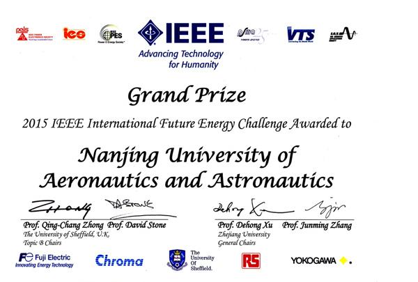 2015年国际未来能源挑战赛(International Future Energy Challenge, IFEC) 主题B的决赛于2015年7月19日在英国谢菲尔德大学举行,WilliamHill官网WilliamHill中文官方网站电气工程系学生组成的参赛队伍(陈欣然、贾雷、冷阳和刘飞,指导教师:阮新波教授)获得总分第一的优异成绩,并勇夺大赛“特等奖(Grand Prize)”和10000美元奖金。