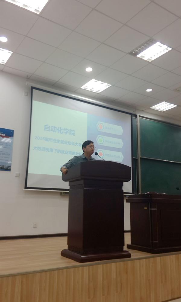 9月21日下午,我院在将军路校区D1213教室召开了以“大数据视角下的就业策略分析”为主题的2016届本科毕业生就业动员大会。院党委副书记沈伯秀出席会议,毕业班辅导员陶琨、晏辞参会。