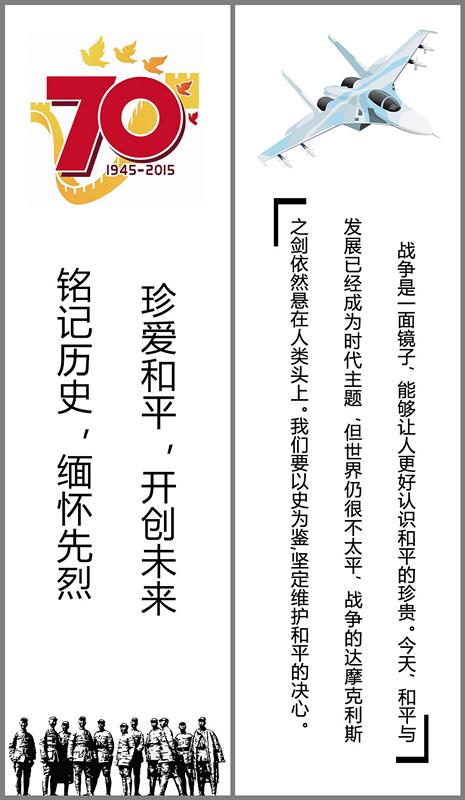 本次活动,通过征集主题作品,以多种形式来纪念中国人民抗日战争暨世界反法西斯战争胜利70周年,让“铭记历史、缅怀先烈、珍爱和平、开创未来”的箴言深入人心,引导同学们积极参与到和平文化的宣传教育中来,前事不忘后事之师。