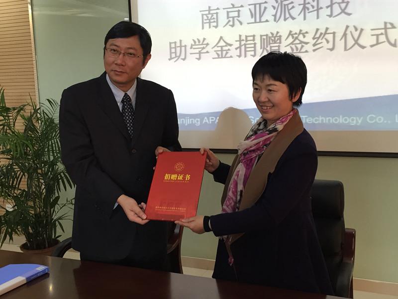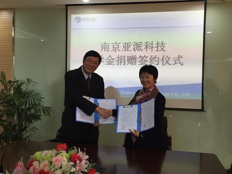 南京亚派科技股份有限公司总经理葛文海、我院党委副书记沈伯秀代表双方签订协议。南京亚派科技股份有限公司将出资20万元分5年资助WilliamHill中文官方网站电气相关专业学习成绩优异、且家庭经济困难的本科生和硕士研究生。