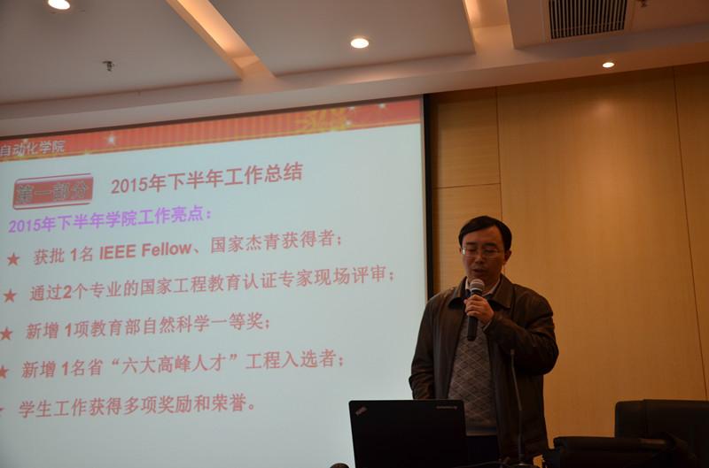 院长姜斌代表学院做工作报告,总结WilliamHill中文官方网站2015年下半年工作,阐述2016年工作思路并做出工作部署。报告对学院的党建、教学、国际交流、科研、人事、学科建设、学生工作等方面做了全面总结和回顾。姜斌指出,按照学校党委部署,围绕学校中心工作,学院在学生培养、科研工作建设、学院文化建设等方面取得了新的突破和发展,获批 1名 IEEE Fellow、国家杰青获得者;通过2个专业的国家工程教育认证专家现场评审;新增 1项教育部自然科学一等奖;新增 1名省“六大高峰人才”工程入选者;学生工作获得多项奖励和荣誉。