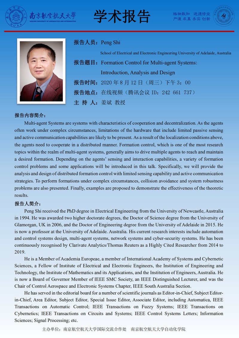 学术报告:Formation Control for Multi-agent Systems: Introduction, Analysis and Design
