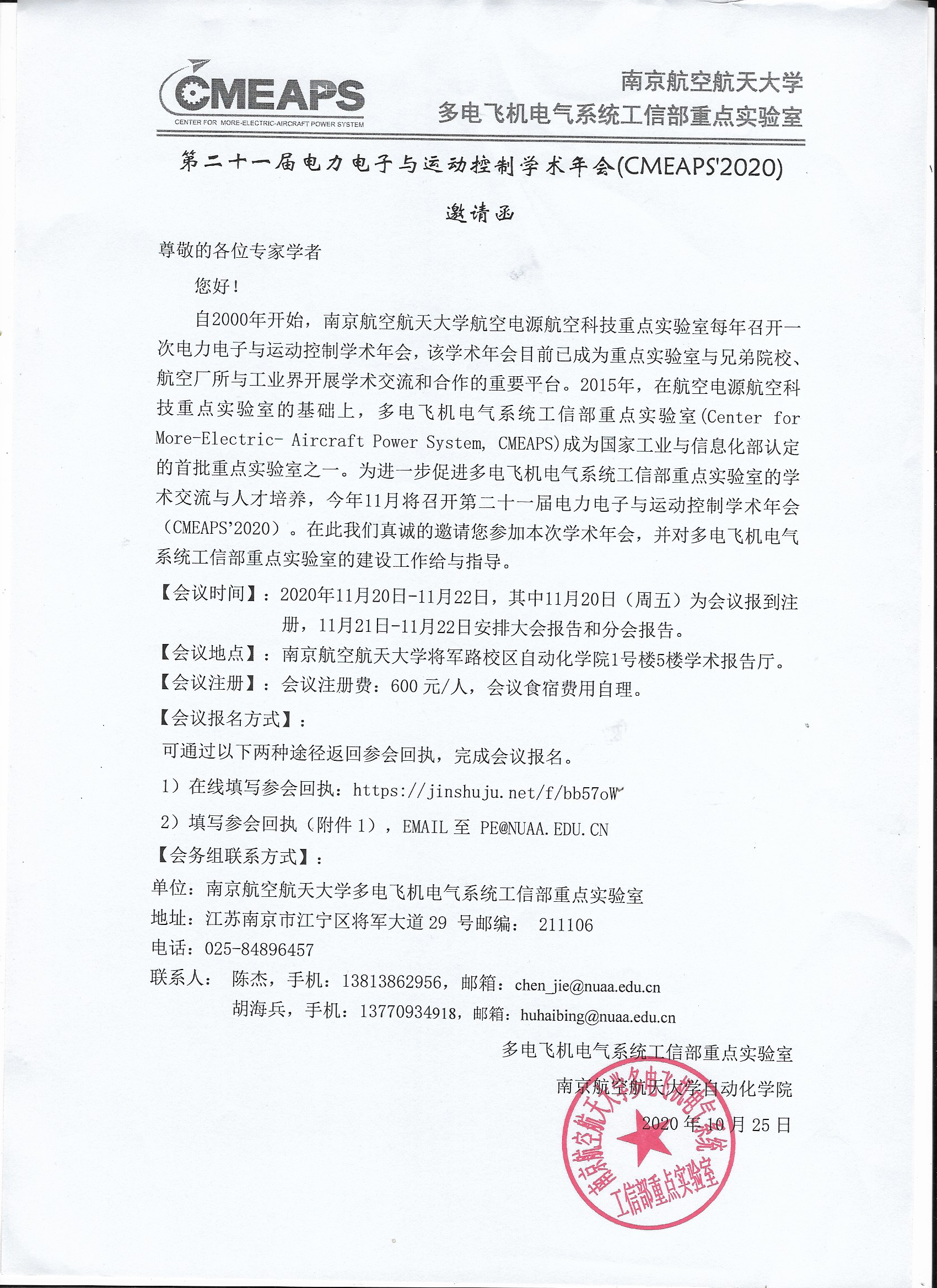 自2000年开始,williamhill英国中文官网航空电源航空科技重点实验室每年召开一次电力电子与运动控制学术年会,该学术年会目前已成为重点实验室与兄弟院校、航空厂所与工业界开展学术交流和合作的重要平台。2015年,在航空电源航空科技重点实验室的基础上,多电飞机电气系统工信部重点实验室(Center for More-Electric- Aircraft Power System, CMEAPS)成为国家工业与信息化部认定的首批重点实验室之一。为进一步促进多电飞机电气系统工信部重点实验室的学术交流与人才培养,今年11月将召开第二十一届电力电子与运动控制学术年会(CMEAPS’2020)。在此我们真诚的邀请您参加本次学术年会,并对多电飞机电气系统工信部重点实验室的建设工作给与指导。