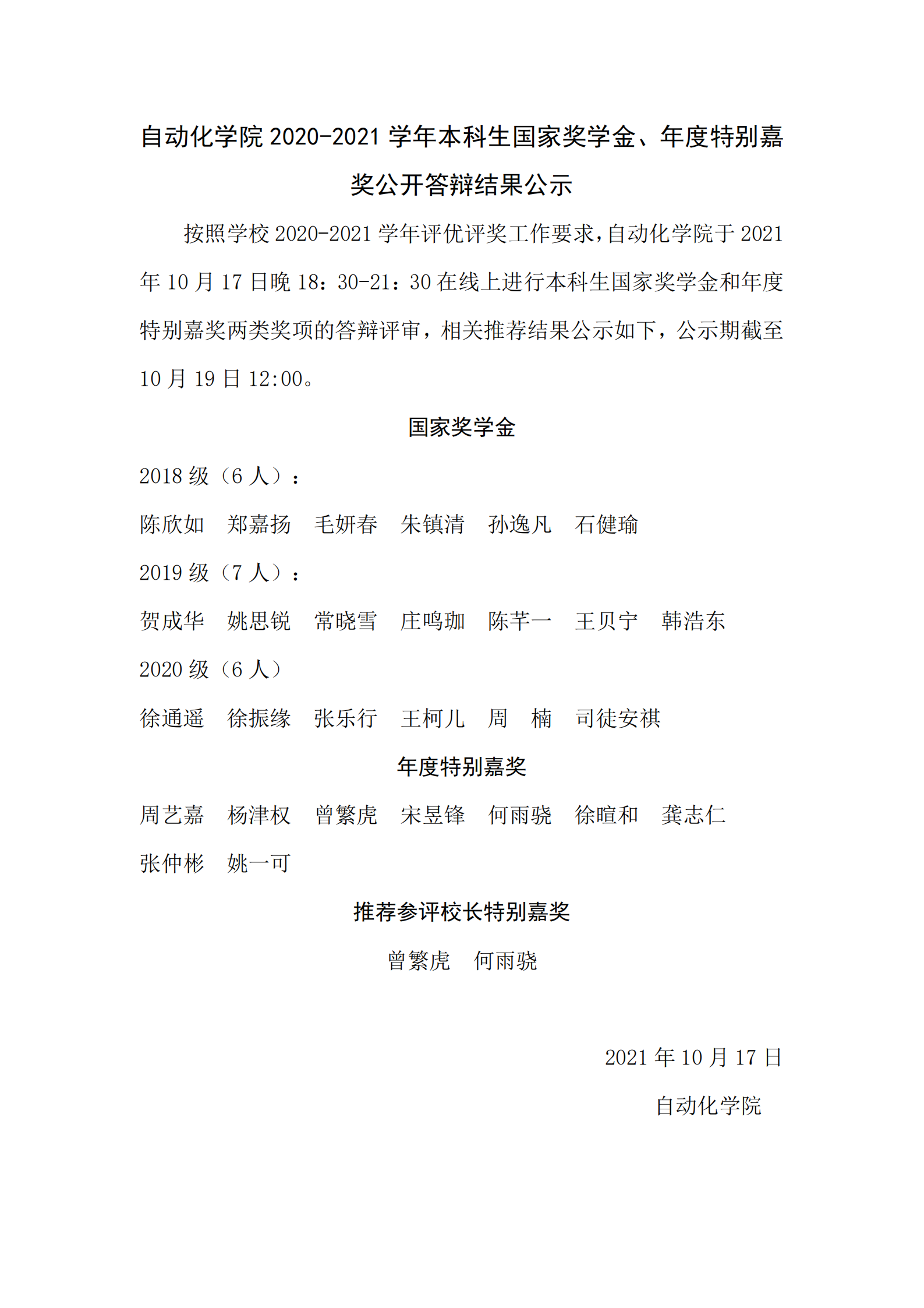 WilliamHill中文官方网站2020-2021学年本科生国家奖学金、年度特别嘉奖公开答辩结果公示