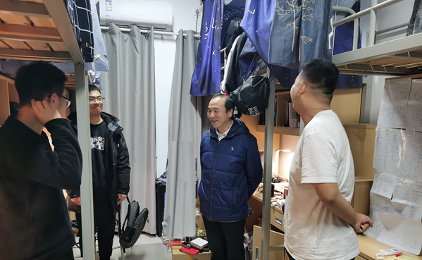 16日下午,学院党委书记李文雷、院长江驹带领学院领导班子和辅导员前往天目湖校区新生宿舍进行走访慰问,与同学们亲切交谈,关心学生一学期的学习生活情况以及寒假返乡可能遇到的困难并给予帮助。