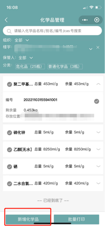 5.在确认了数量和剩余量后,点击此化学品,展开明细;确认每一瓶的剩余量;