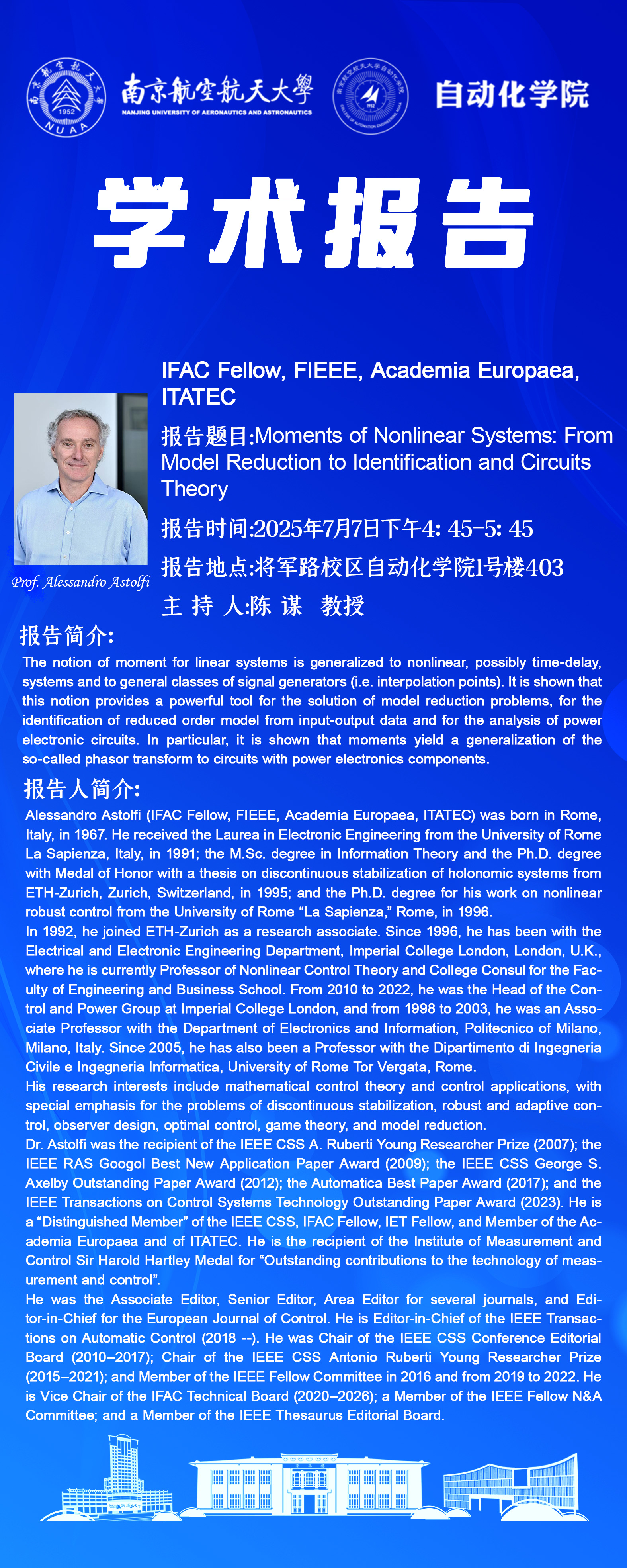 【学术报告】Alessandro Astolfi:Moments of Nonlinear Systems: From Model Reduction to Identification and Circuits Theory