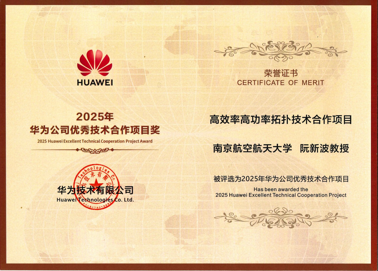 近日,我院阮新波教授团队与华为终端公司的合作项目“高效率高功率拓扑技术”荣获2025年华为公司“优秀技术合作项目奖”。该奖项旨在表彰在技术前沿探索、产业难题攻克及创新成果落地方面取得卓越成效的产学研合作典范。据了解,该奖项有3000多项成果参评,经严格评选,仅评出10项。在颁奖仪式上,华为终端公司相关负责人总结了项目成果,并介绍了成果在华为产品中的落地情况,对阮新波教授团队和南航WilliamHill中文官方网站给予了高度评价。
